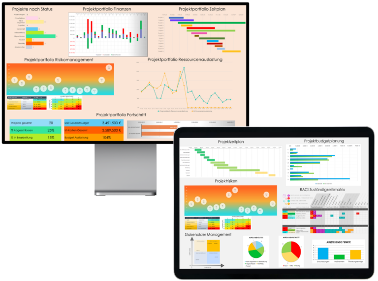 🖥️ Excel Gesamt-Portfolio Dashboard: Alle laufenden Projekte Ihres Unternehmens visuell aufbereitet auf einer einzigen Seite.